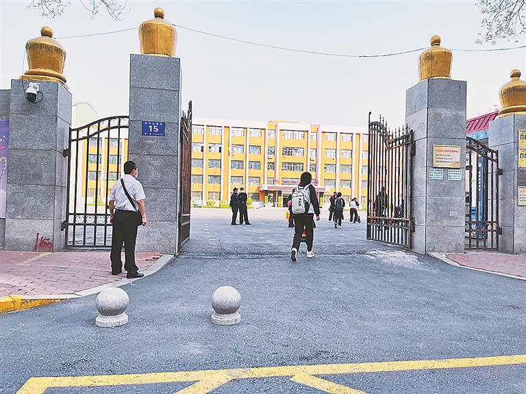 7時(shí)左右,在哈市第113中學(xué)記者看到,學(xué)校早早做好準(zhǔn)備,教師來(lái)到門口迎接學(xué)生,按防疫規(guī)定,學(xué)生有序進(jìn)行測(cè)溫后進(jìn)入教學(xué)樓。為防止聚集,不同班級(jí)的學(xué)生從教學(xué)樓不同的大門進(jìn)入。