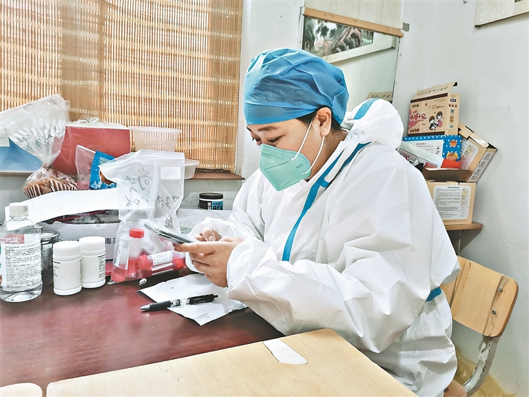 麻利地整理好當天核酸檢測的物資后,田麗娟便提前來到核酸采樣現(xiàn)場,確認“2米線”設置、物資擺放、核對數(shù)量……忙碌的一天開始了?!罢埓蠹矣行蛳聵亲龊怂帷薄敖禍亓?,記得多穿點”,田麗娟一遍遍在群里提示社區(qū)人員告知居民,從事社區(qū)工作近10年的她,不僅對轄區(qū)情況爛熟于心,更對居民多了親人般的關(guān)心和記掛。6時30分許,核酸采樣有序開始,偶爾碰到不太配合或有抱怨的居民,田麗娟總是第一時間上前耐心地解釋和勸導,保證現(xiàn)場秩序井然。