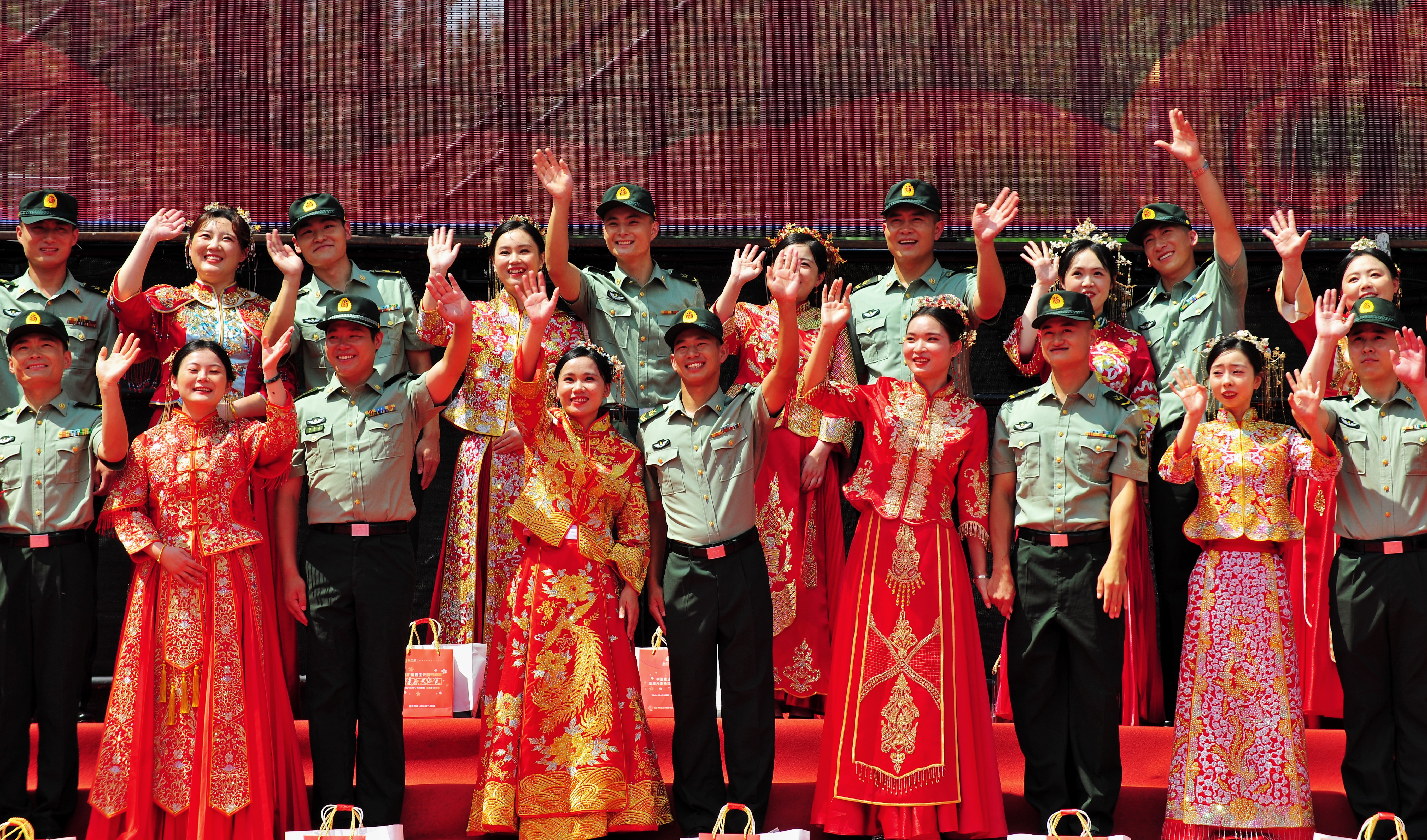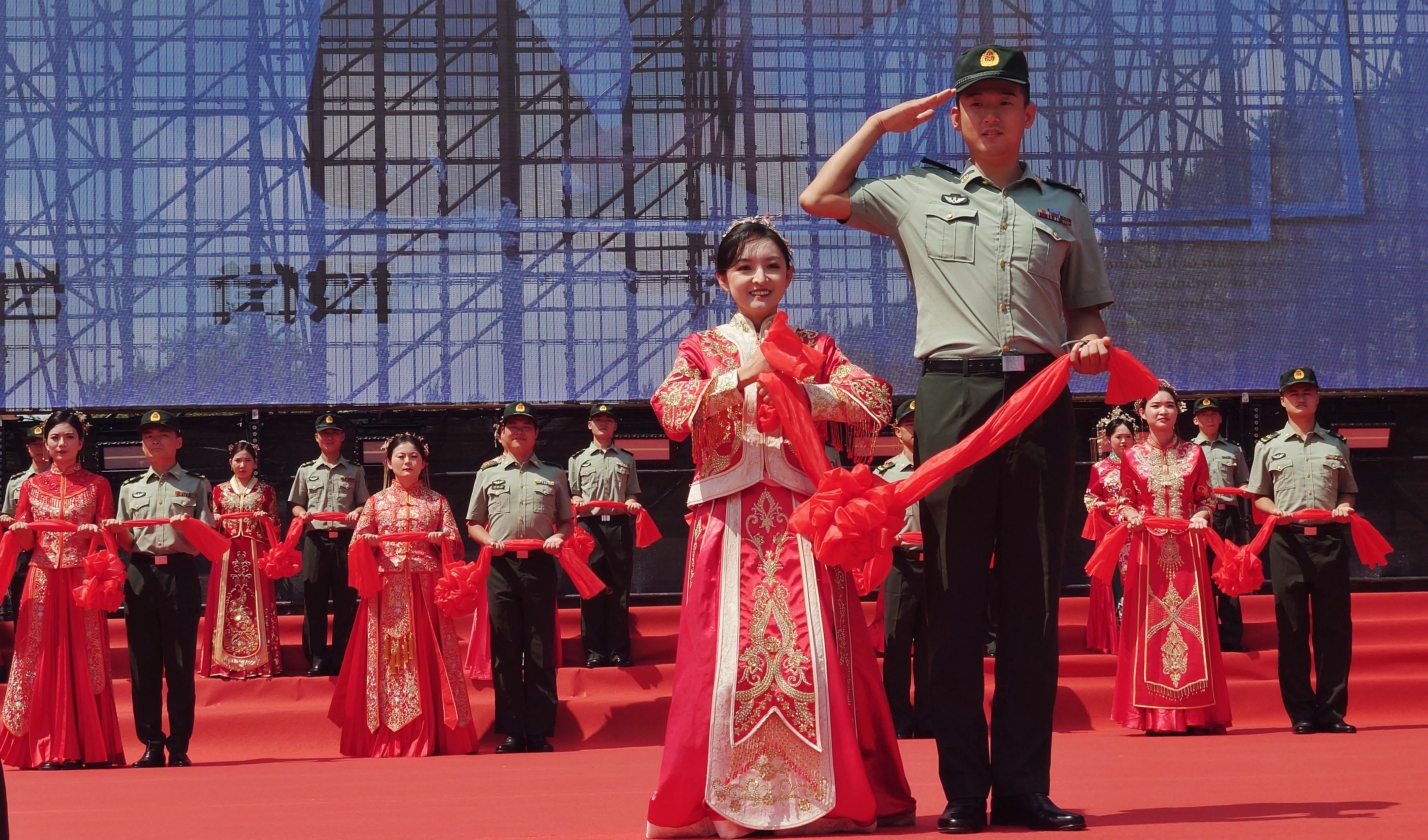 伴著悠揚(yáng)的樂曲,身穿軍裝的新郎和穿著龍鳳袍的新娘,手牽紅色花球走上典禮臺(tái),行結(jié)拜禮、結(jié)發(fā)禮等,并共同宣讀愛的誓言,許下相愛一生的承諾。