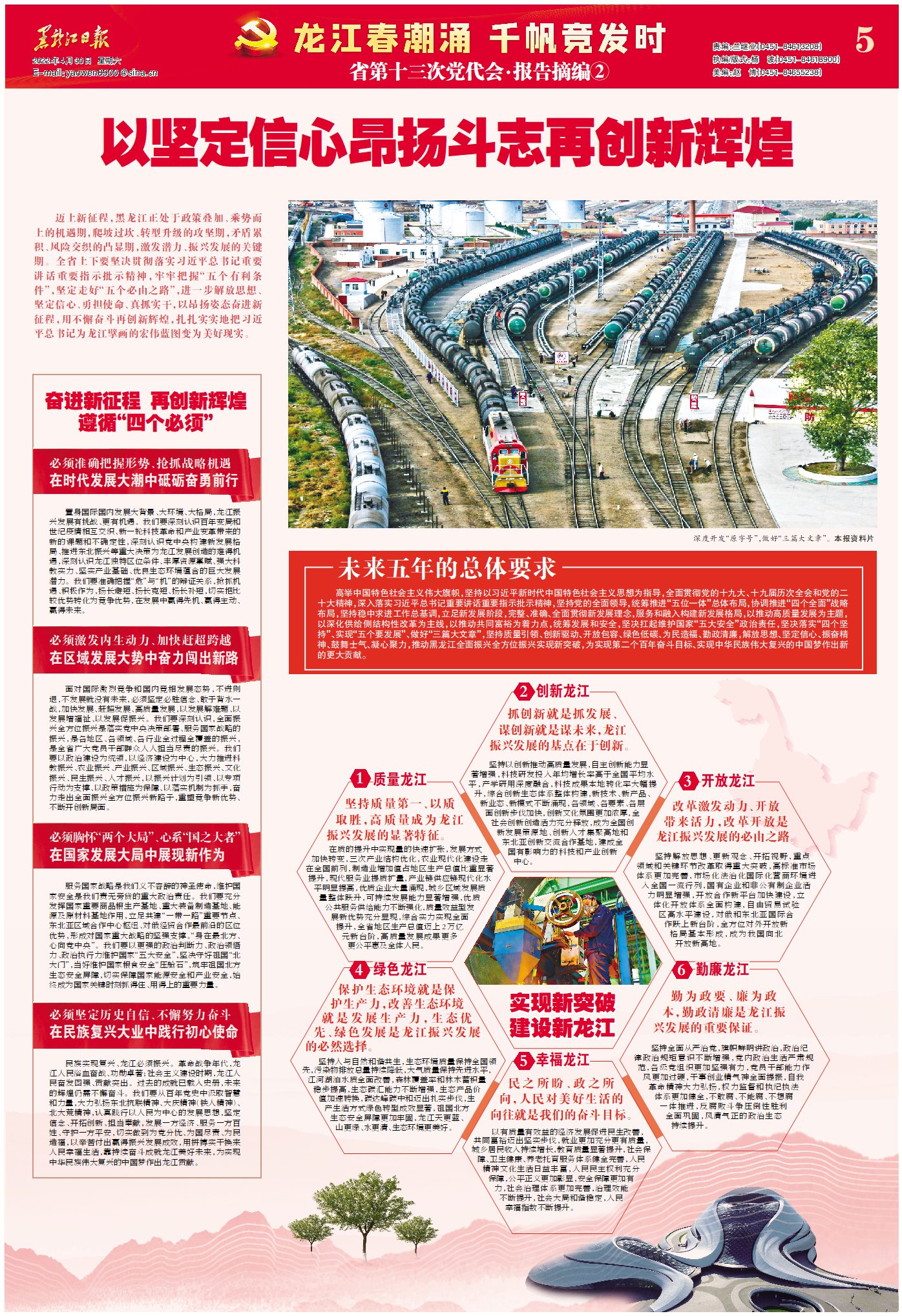 高舉中國(guó)特色社會(huì)主義偉大旗幟,堅(jiān)持以習(xí)近平新時(shí)代中國(guó)特色社會(huì)主義思想為指導(dǎo),全面貫徹黨的十九大、十九屆歷次全會(huì)和黨的二十大精神,深入落實(shí)習(xí)近平總書(shū)記重要講話(huà)重要指示批示精神,堅(jiān)持黨的全面領(lǐng)導(dǎo),統(tǒng)籌推進(jìn)“五位一體”總體布局,協(xié)調(diào)推進(jìn)“四個(gè)全面”戰(zhàn)略布局,堅(jiān)持穩(wěn)中求進(jìn)工作總基調(diào),立足新發(fā)展階段,完整、準(zhǔn)確、全面貫徹新發(fā)展理念,服務(wù)和融入構(gòu)建新發(fā)展格局,以推動(dòng)高質(zhì)量發(fā)展為主題,以深化供給側(cè)結(jié)構(gòu)性改革為主線(xiàn),以推動(dòng)共同富裕為著力點(diǎn),統(tǒng)籌發(fā)展和安全,堅(jiān)決扛起維護(hù)國(guó)家“五大安全”政治責(zé)任,堅(jiān)決落實(shí)“四個(gè)堅(jiān)持”、實(shí)現(xiàn)“五個(gè)要發(fā)展”、做好“三篇大文章”,堅(jiān)持質(zhì)量引領(lǐng)、創(chuàng)新驅(qū)動(dòng)、開(kāi)放包容、綠色低碳、為民造福、勤政清廉,解放思想、堅(jiān)定信心、振奮精神、鼓舞士氣、凝心聚力,推動(dòng)黑龍江全面振興全方位振興實(shí)現(xiàn)新突破,為實(shí)現(xiàn)第二個(gè)百年奮斗目標(biāo)、實(shí)現(xiàn)中華民族偉大復(fù)興的中國(guó)夢(mèng)作出新的更大貢獻(xiàn)。