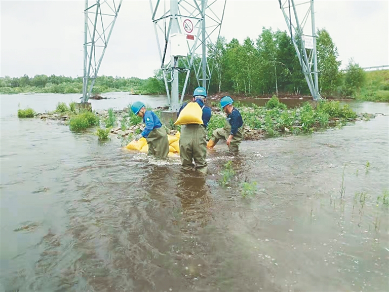 國網(wǎng)大興安嶺供電公司搶修人員在湍急的洪水中肩扛沙袋保護(hù)鐵塔基礎(chǔ)。