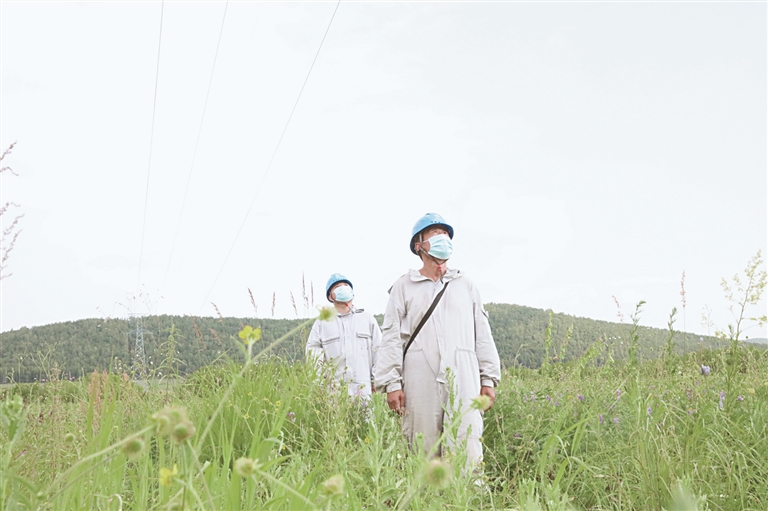 國網(wǎng)大興安嶺供電公司輸電運(yùn)檢人員頂著烈日查看輸電線路。