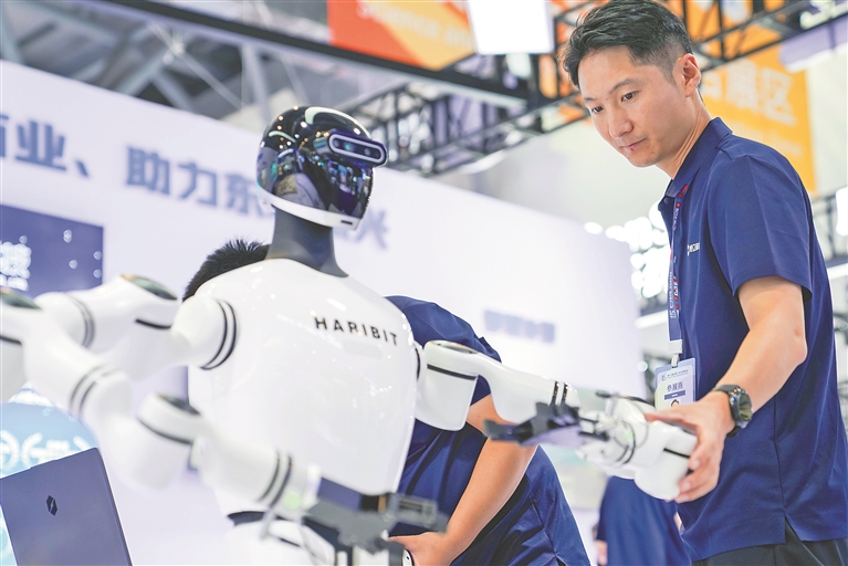 工作人員在第十五屆中國-東北亞博覽會現(xiàn)代化產(chǎn)業(yè)館內(nèi)調(diào)試展出的具身智能機器人產(chǎn)品。
