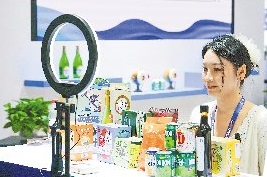 參展商在第十五屆中國-東北亞博覽會現(xiàn)場進行線上直播。新華社發(fā)