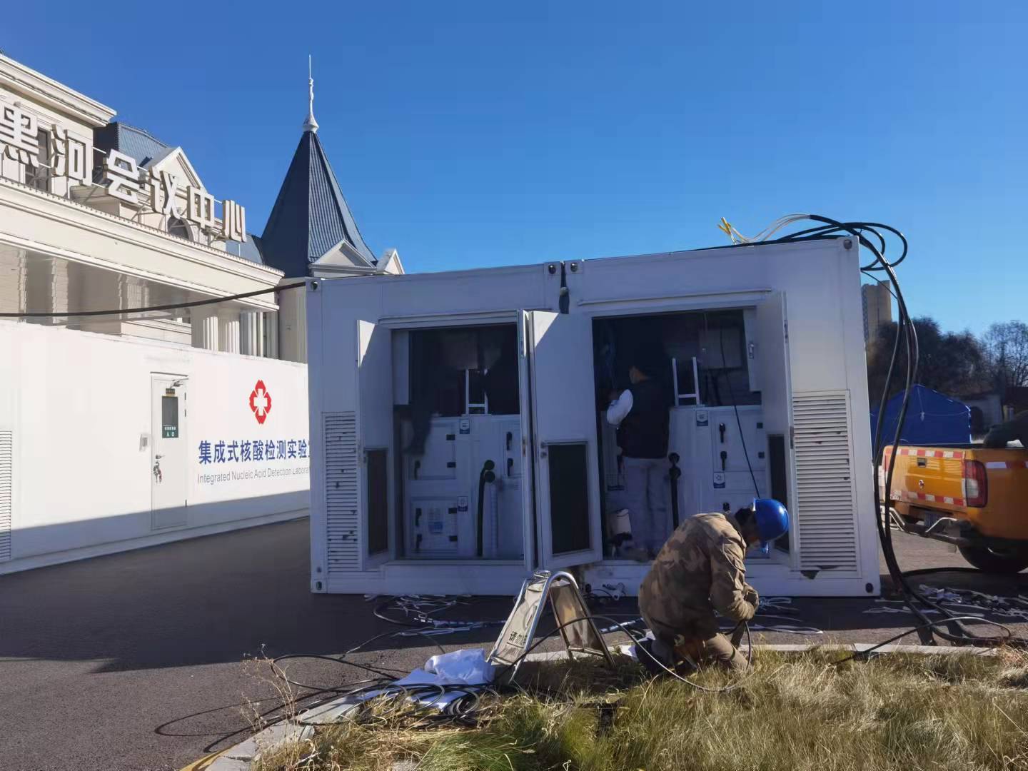 在“火眼號”附近,黑龍江省傳染病防治院的兩個集成式核酸檢測實(shí)驗(yàn)室正在接入電源,每個集成式核酸檢測實(shí)驗(yàn)室檢測能力可達(dá)到日檢測樣本5000份,日檢測50000人。