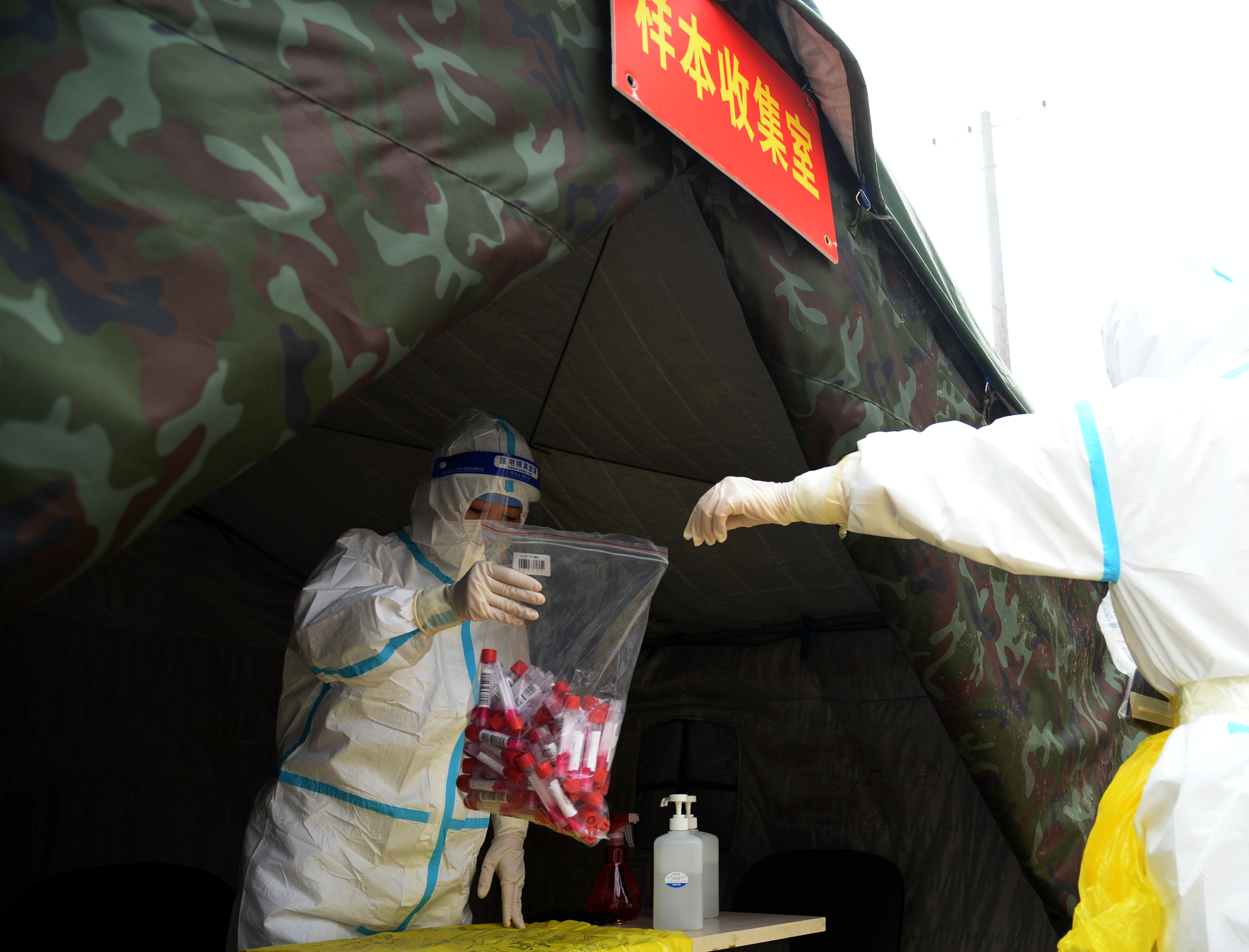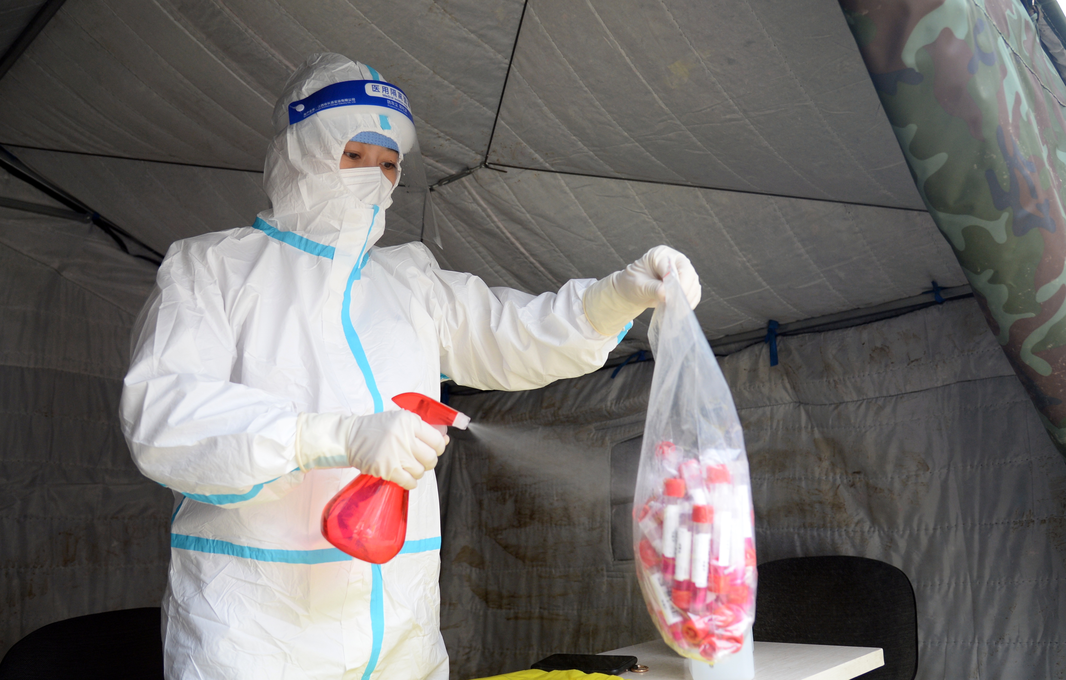 10時(shí)15分,第一組醫(yī)務(wù)人員完成核酸采集工作,在樣本收集區(qū)將采集樣本交給收集人,隨后由收集人對(duì)采集樣本進(jìn)行消殺后裝箱集中轉(zhuǎn)運(yùn)。