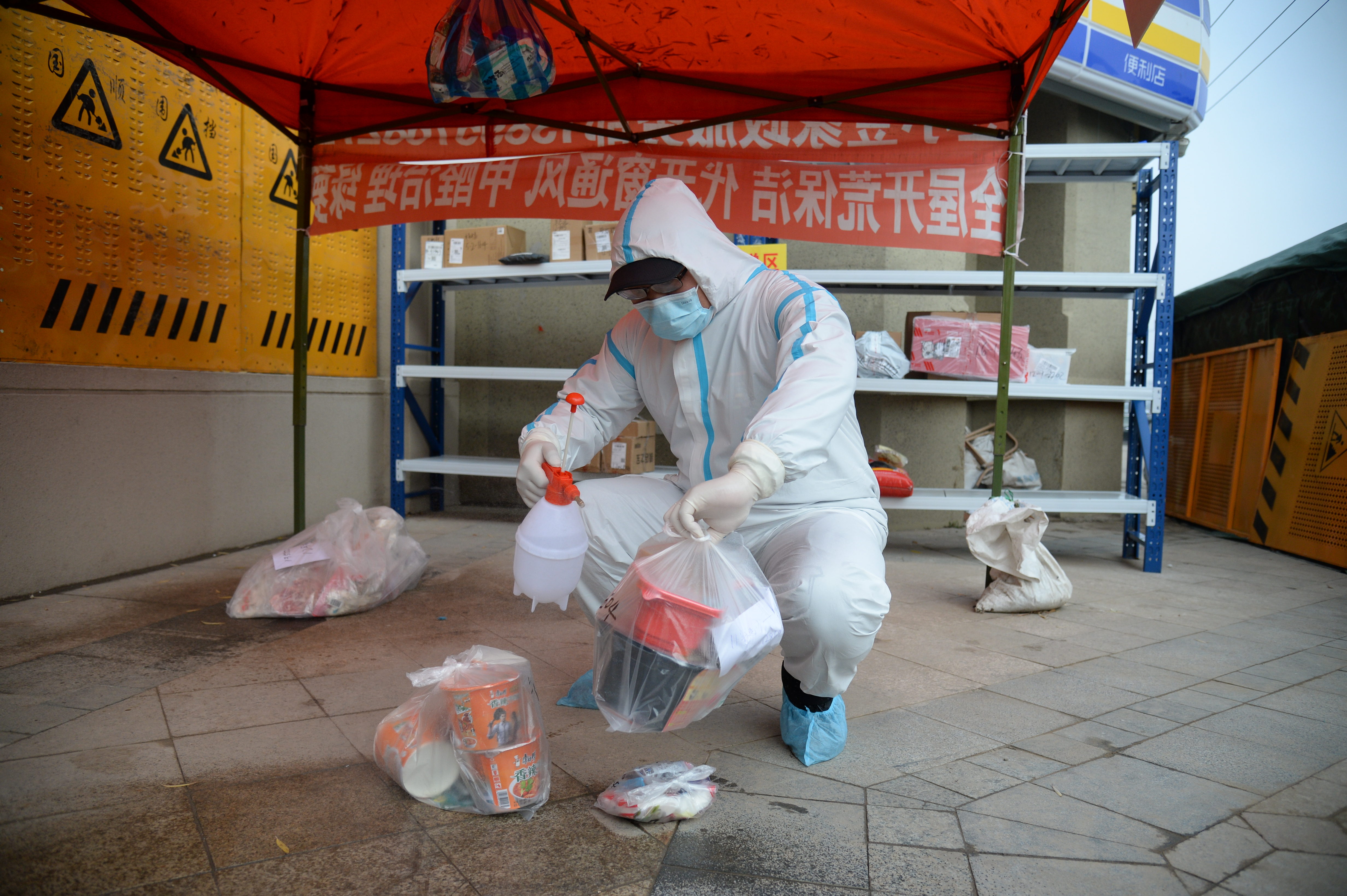 8時(shí)30分,記者在該小區(qū)正門前看到,整個(gè)小區(qū)僅留一個(gè)可供工作人員出入的門通行,非工作人員只進(jìn)不出,其他出入口全部封閉。在正門前,防疫人員設(shè)置了外賣投放消殺區(qū),經(jīng)過對(duì)這些外賣物品、食品的外包裝進(jìn)行消殺處理后,送到小區(qū)門口的第一道隔離區(qū)域。第一道隔離區(qū)的工作人員身穿防護(hù)服,把這些用品送到第二道隔離區(qū)域,該區(qū)域的工作人員再把東西搬到電動(dòng)三輪車上,根據(jù)物品上標(biāo)注的樓號(hào)與單元號(hào)逐一進(jìn)行投送。
