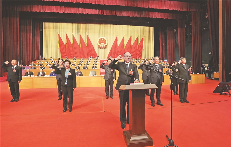 會議舉行憲法宣誓儀式。新當選人員在與會全體代表的見證下向憲法宣誓。許勤領誓。