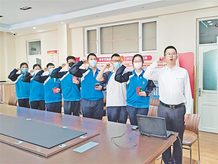 2022年5月4日,陳亮(右一)帶領(lǐng)新團(tuán)員進(jìn)行入團(tuán)宣誓。圖片由團(tuán)省委提供