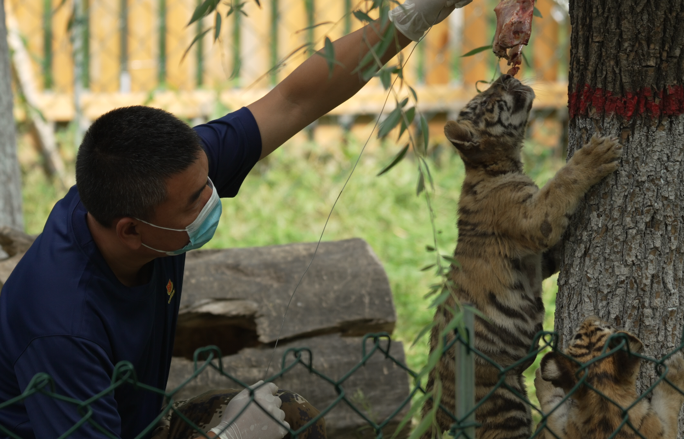 當(dāng)人工繁育的東北虎成長(zhǎng)到6個(gè)月后,就會(huì)進(jìn)行合群,放到園區(qū)內(nèi)野化飼養(yǎng),讓它們回歸更自由寬敞的環(huán)境,這時(shí)照料東北虎的接力棒,就到了園區(qū)飼養(yǎng)員葉華旭的手中。
