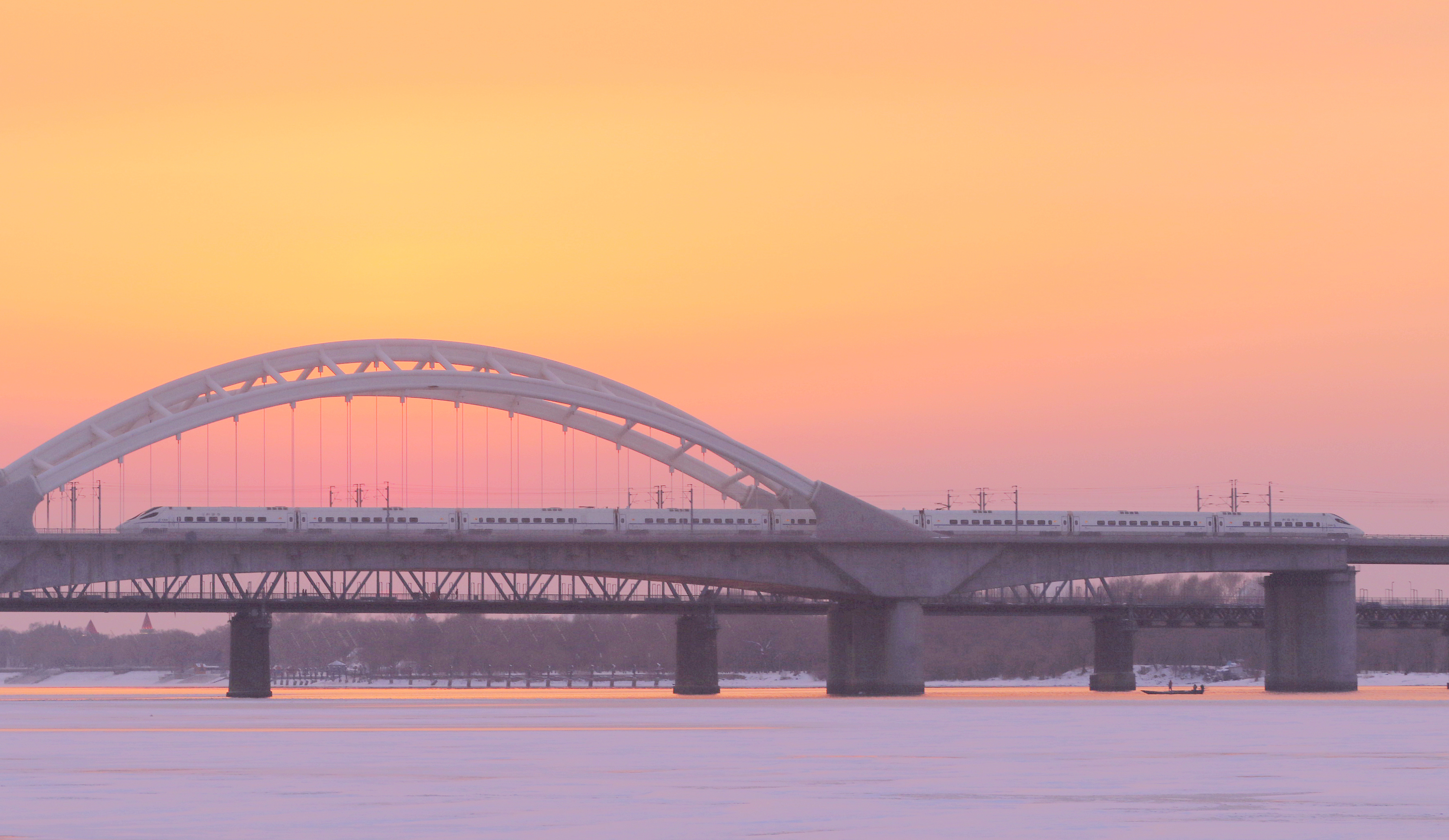 動(dòng)車組列車駛過(guò)冰封的松花江