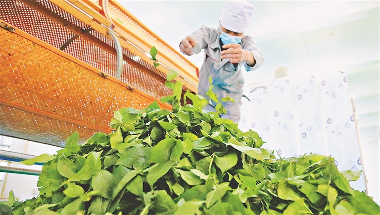 工作人員對(duì)烘干完的刺五加茶進(jìn)行分揀。