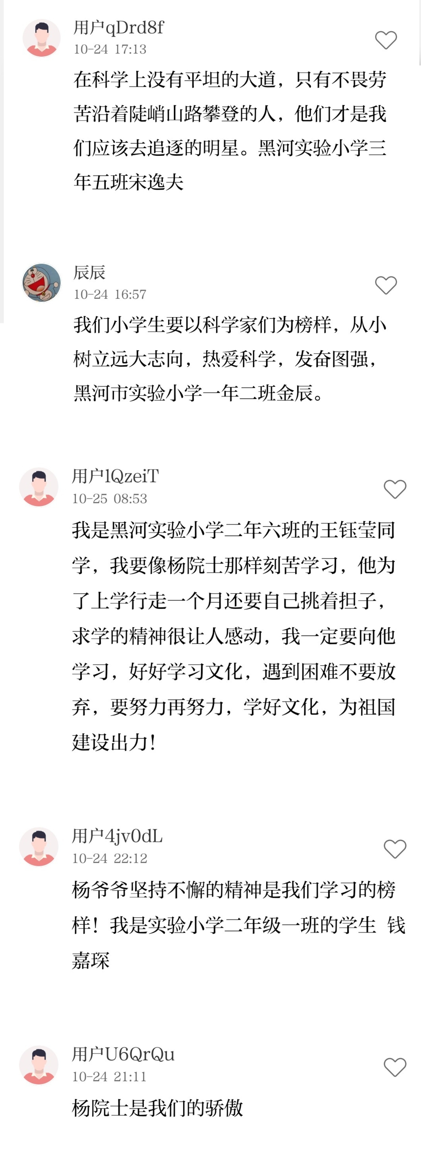 黑河市實(shí)驗(yàn)小學(xué)組織學(xué)習(xí)楊士莪院士、楊德森院士的故事,學(xué)生們被他們“心有大我,至誠(chéng)報(bào)國(guó)”的感人事跡和愛國(guó)情懷深深震撼。學(xué)生們紛紛在龍頭新聞客戶端留言,向他們心懷國(guó)家,不畏艱難、砥礪前行,用科技的力量為祖國(guó)三百萬(wàn)平方公里的藍(lán)色海疆保駕護(hù)航的愛國(guó)之情致敬。