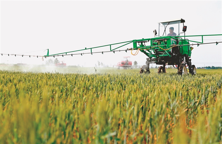 圖② 技術(shù)人員使用自走式高桿噴霧機在麥田里作業(yè)。