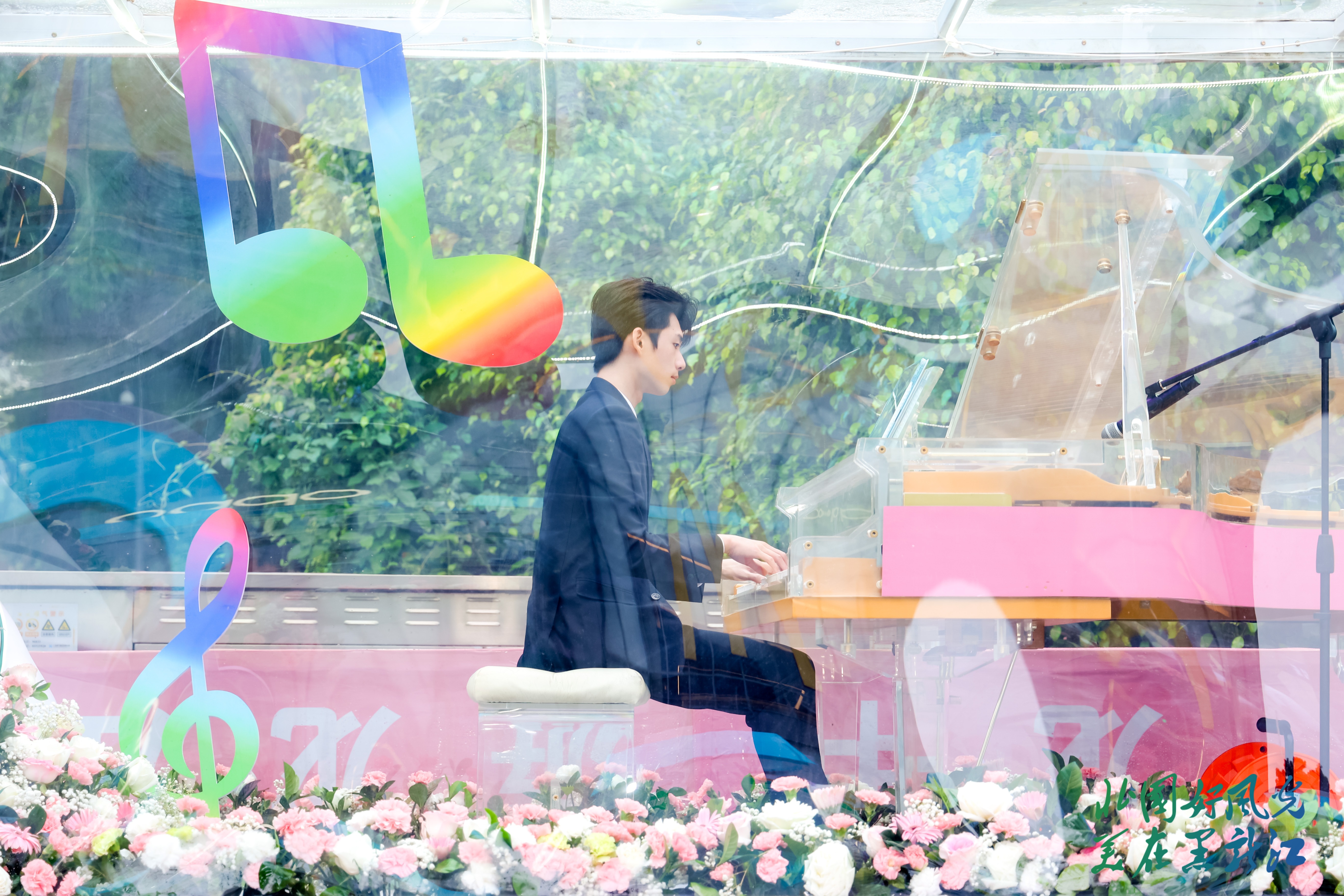 樂手在音樂主題車彈奏鋼琴
