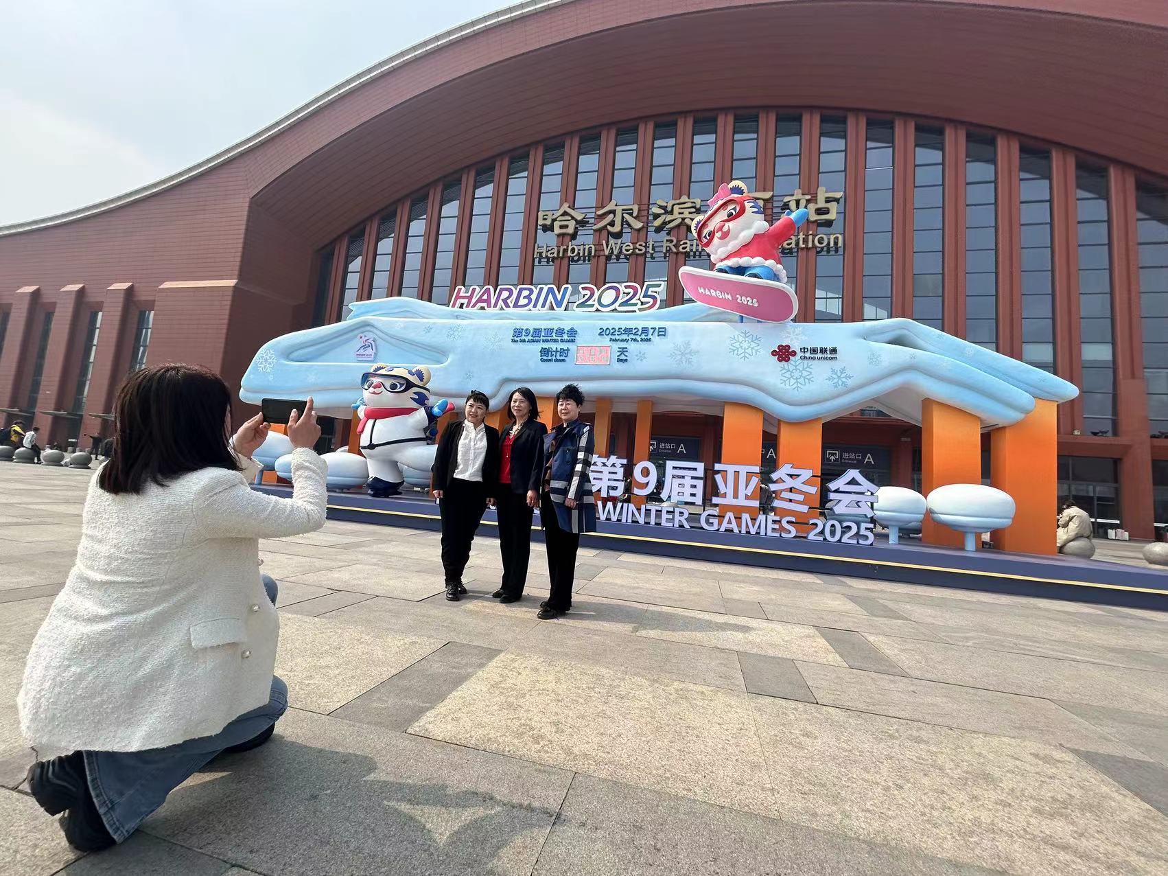 記者在現(xiàn)場(chǎng)看到,寫(xiě)有“2025年第九屆亞冬會(huì)”雪屋雕塑在哈爾濱西站東入口處格外醒目,可愛(ài)的亞冬會(huì)吉祥物“濱濱”擺出熱烈歡迎的姿勢(shì),腳踩滑板、身穿中國(guó)民間傳統(tǒng)毛領(lǐng)節(jié)慶紅襖的“妮妮”分外喜慶。無(wú)論是市民還是遠(yuǎn)道而來(lái)的旅客,在這里都能感受到北國(guó)冬日的魅力。