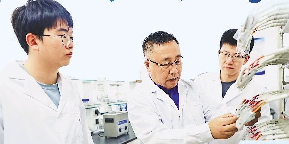 哈工大教授袁國(guó)輝(中)指導(dǎo)博士生研究采用石墨負(fù)極材料的鋰離子電池。 本報(bào)記者 韓東賢攝