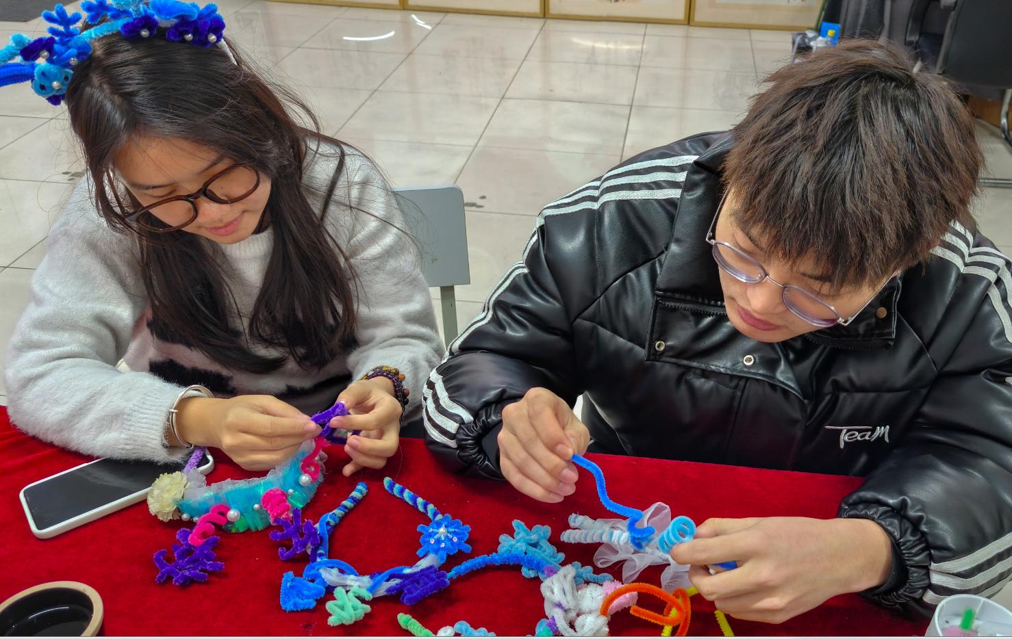 學(xué)生們以充滿趣味性的“扭扭棒”作為主要?jiǎng)?chuàng)作材料,通過(guò)彎曲、纏繞,將這些簡(jiǎn)單的材料變成各種形態(tài)與圖案。他們?cè)谧髌分星擅畹厝谌肓吮┰?、哈爾濱的地標(biāo)建筑以及亞冬會(huì)的相關(guān)標(biāo)識(shí),每一件作品都充滿濃厚的地域特色。