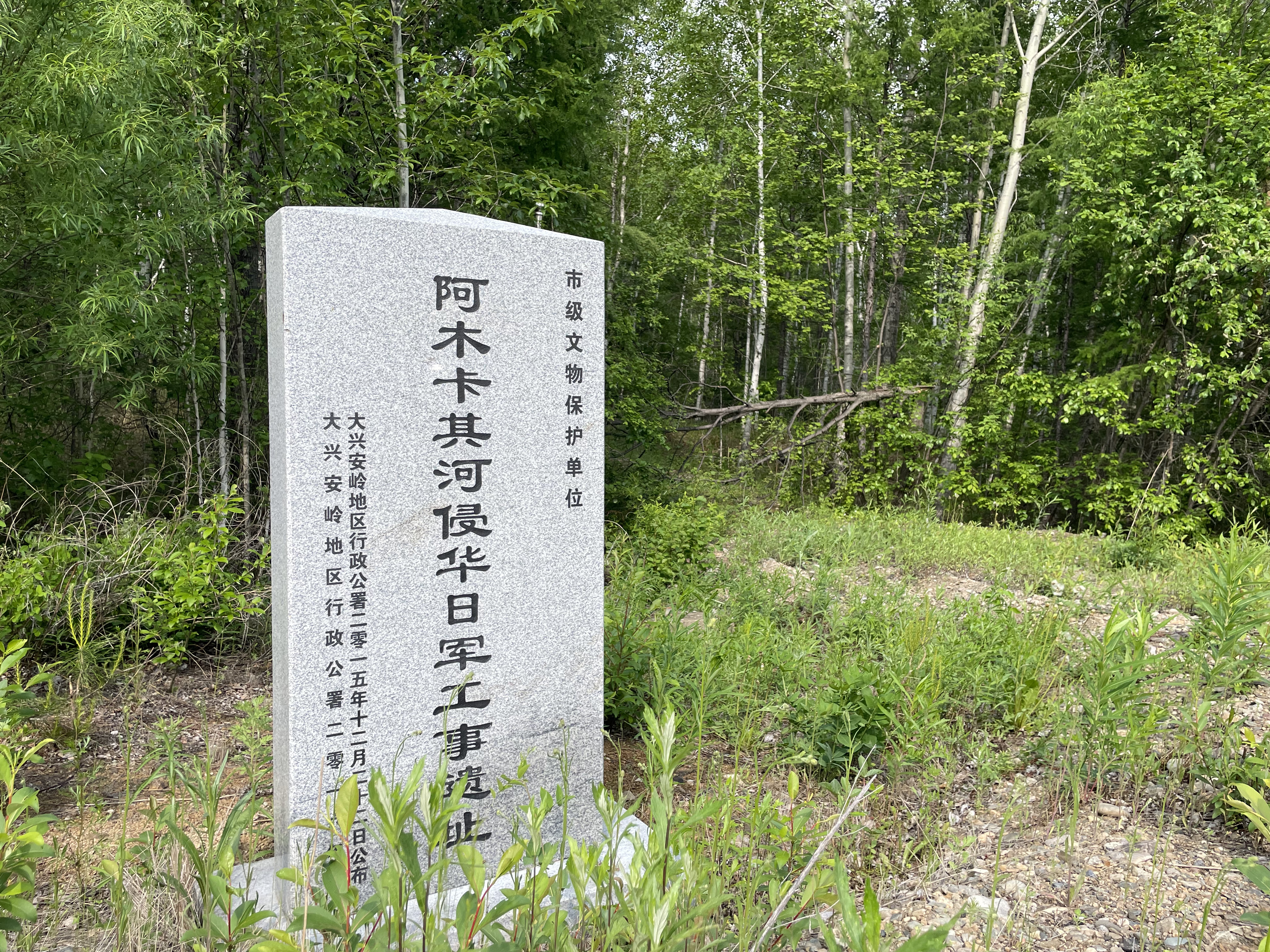 在韓家園林業(yè)局接上向?qū)c林業(yè)局的同事,沿著502鄉(xiāng)道折向西北,27分鐘后,密林深處防火公路旁,一塊“市級(jí)文物保護(hù)單位”的石碑靜立右側(cè),碑身鐫刻的“阿木卡其河侵華日軍工事遺址”字樣,如同撕裂時(shí)光的疤痕。