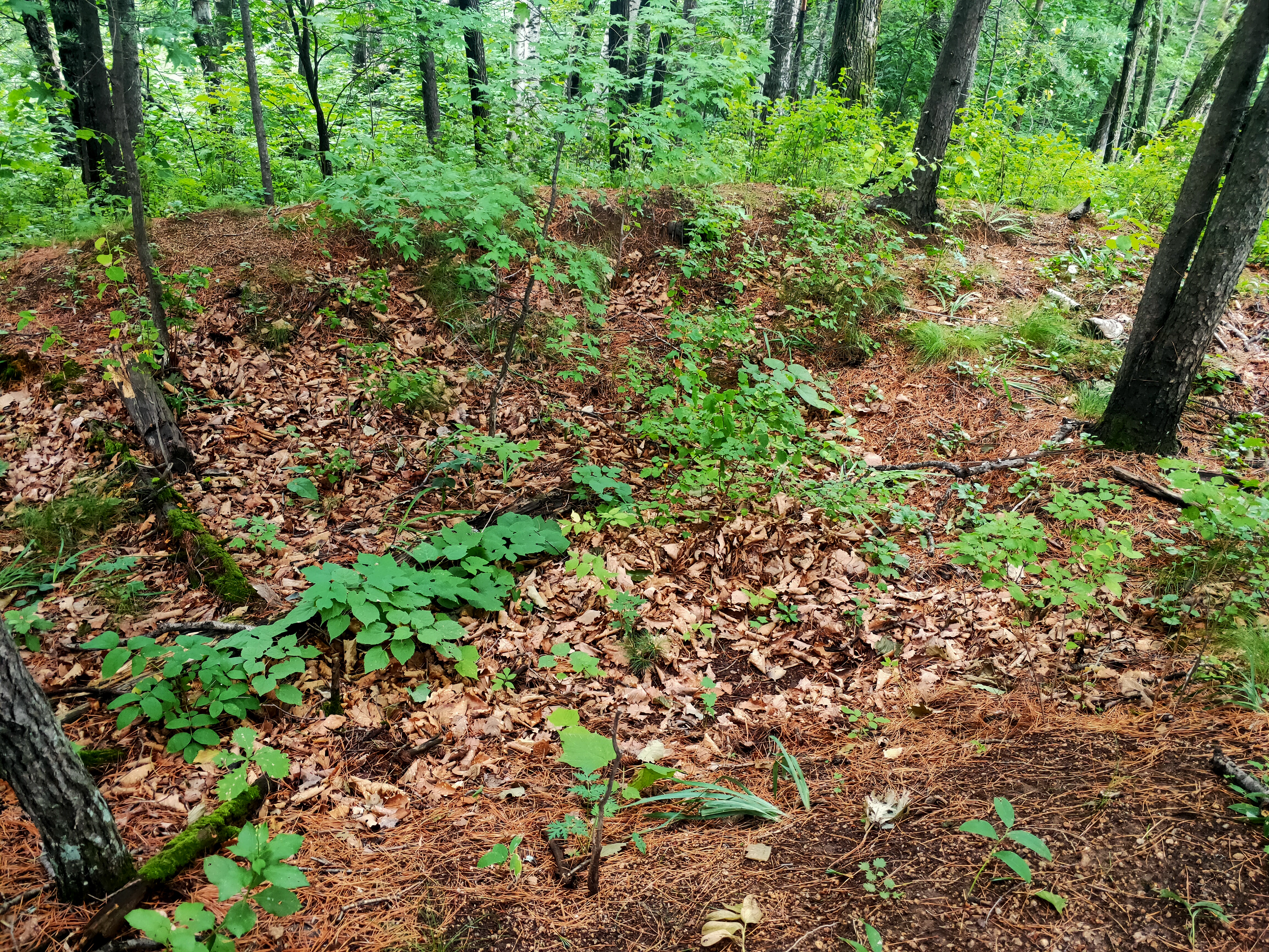 張海欣指著前方一道隱約可見的土埂說:“這就是頭道卡子,抗聯(lián)密營的第一道防線?!庇浾咦呓瞬趴辞?,這是一條長約20米的戰(zhàn)壕,泥土雖已松軟,但輪廓依然清晰,壕溝盡頭的兩處土堆格外顯眼。