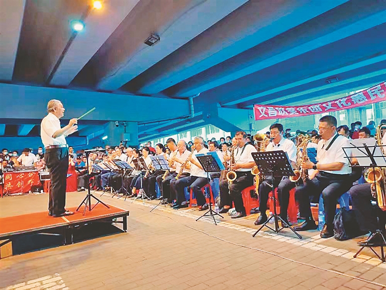 遇到觀眾熟悉的曲目,王輝會帶動觀眾一起演唱;幾乎每首樂曲結(jié)束,都能聽到觀眾的叫好聲?!坝^眾是我們的動力,退休后有這樣的文化生活相伴,我的心情也很愉悅?!苯衲?2歲的王福心在樂團中吹大號已經(jīng)十幾年,年輕時從事建筑行業(yè)的他坦言樂團豐富了他的退休生活。