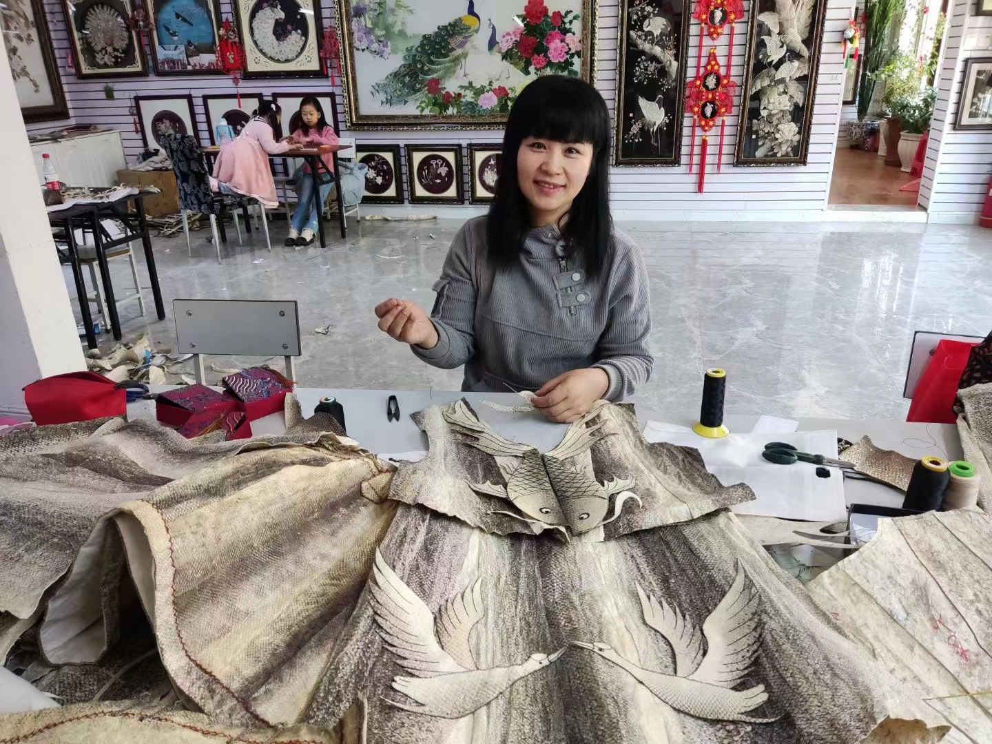 2015年,以農(nóng)民技師為主的魚(yú)皮畫(huà)農(nóng)民合作社成立,2016年,楊雙艷成立同江市巧手坊,同年楊雙艷被評(píng)為同江市非遺代表性傳承人。至此,楊雙艷的非遺之路上了新臺(tái)階,她和學(xué)員們創(chuàng)作非遺產(chǎn)品1萬(wàn)余件,其中,建黨百年制作舉辦了百人百幅剪紙、13米長(zhǎng)赫哲族婚俗系列長(zhǎng)卷、魚(yú)皮畫(huà)作品《長(zhǎng)城》、魚(yú)皮立體刺繡作品《大吉圖》《浩氣凌空》等作品參加了全國(guó)多項(xiàng)工藝美術(shù)大賽,收獲頗豐。