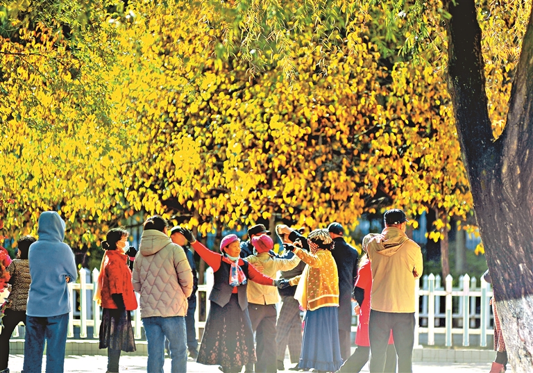 重陽節(jié)當(dāng)天,秋色迷人的哈爾濱市道外區(qū)古梨園內(nèi),許多老年人前來活動、健身。長廊外,他們列隊唱起《紅梅贊》《紅星閃閃亮》……古梨樹下,他們翩翩起舞,感受著美好生活。小廣場上,老年秧歌隊歡快地扭著,成為園內(nèi)一道風(fēng)景。 本報記者 蘇強(qiáng)攝