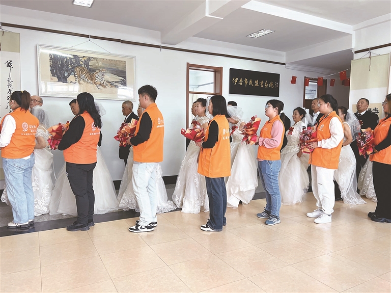 伊春市伊美區(qū)旭日街道社工站聯(lián)合黨建聯(lián)建成員單位舉行“最美重陽·感恩相伴”主題活動。活動邀請轄區(qū)內(nèi)8對年輕時結(jié)婚沒有穿過婚紗的老年夫婦齊聚一堂舉行集體婚禮,以最浪漫的方式,重溫愛的誓言,紀(jì)念幾十年的相依相守。在家人和朋友們的見證下,8對老年夫婦第一次身著禮服、婚紗,手挽手走上紅地毯,在鮮花和掌聲中,記錄下人生中的難忘時刻。
