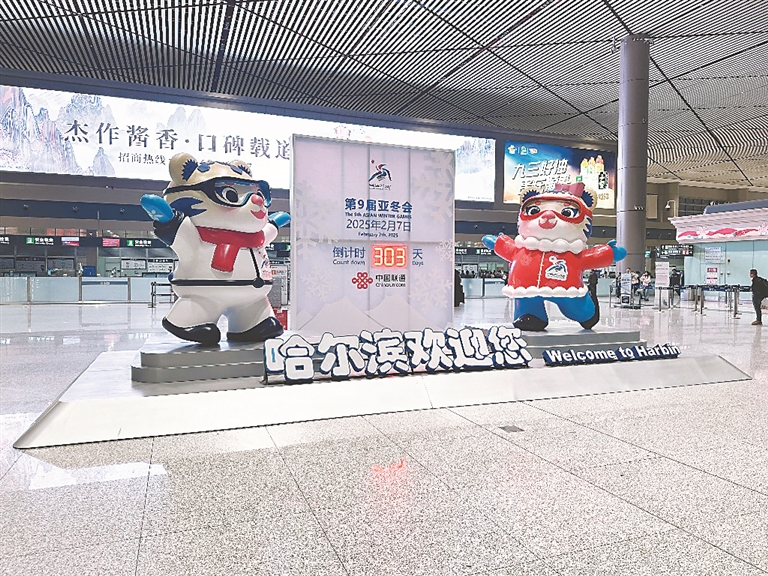 可愛的亞冬會(huì)吉祥物“濱濱”“妮妮”擺出熱烈歡迎的姿勢(shì),為到達(dá)哈爾濱的旅客們提供一個(gè)充滿活力和歡迎感的第一印象。
