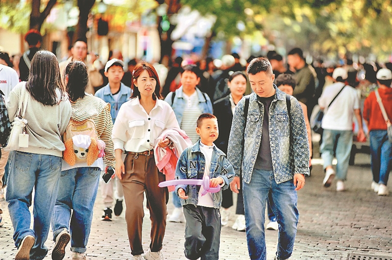 16日,在哈爾濱市道里區(qū)中央大街上,許多市民和外地游客逛街、賞景、拍照,在美好的節(jié)日氛圍中樂(lè)享中秋假期。