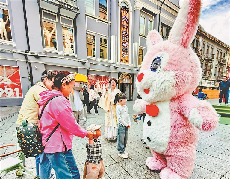 街道兩側(cè)的樹(shù)木盡顯秋色,與百年建筑相互映襯,如同一幅美麗的油畫(huà)。人們紛紛用手機(jī)記錄下精彩瞬間。美食攤位前,烤肉串、烤紅腸、烤魷魚(yú)、鍋包肉等散發(fā)出的香味令人垂涎欲滴;冰棍、格瓦斯、大面包等本地特色食品吸引游客排隊(duì)購(gòu)買;熊貓、老虎、兔子等卡通人偶站在路旁,與游人互動(dòng)、合影。