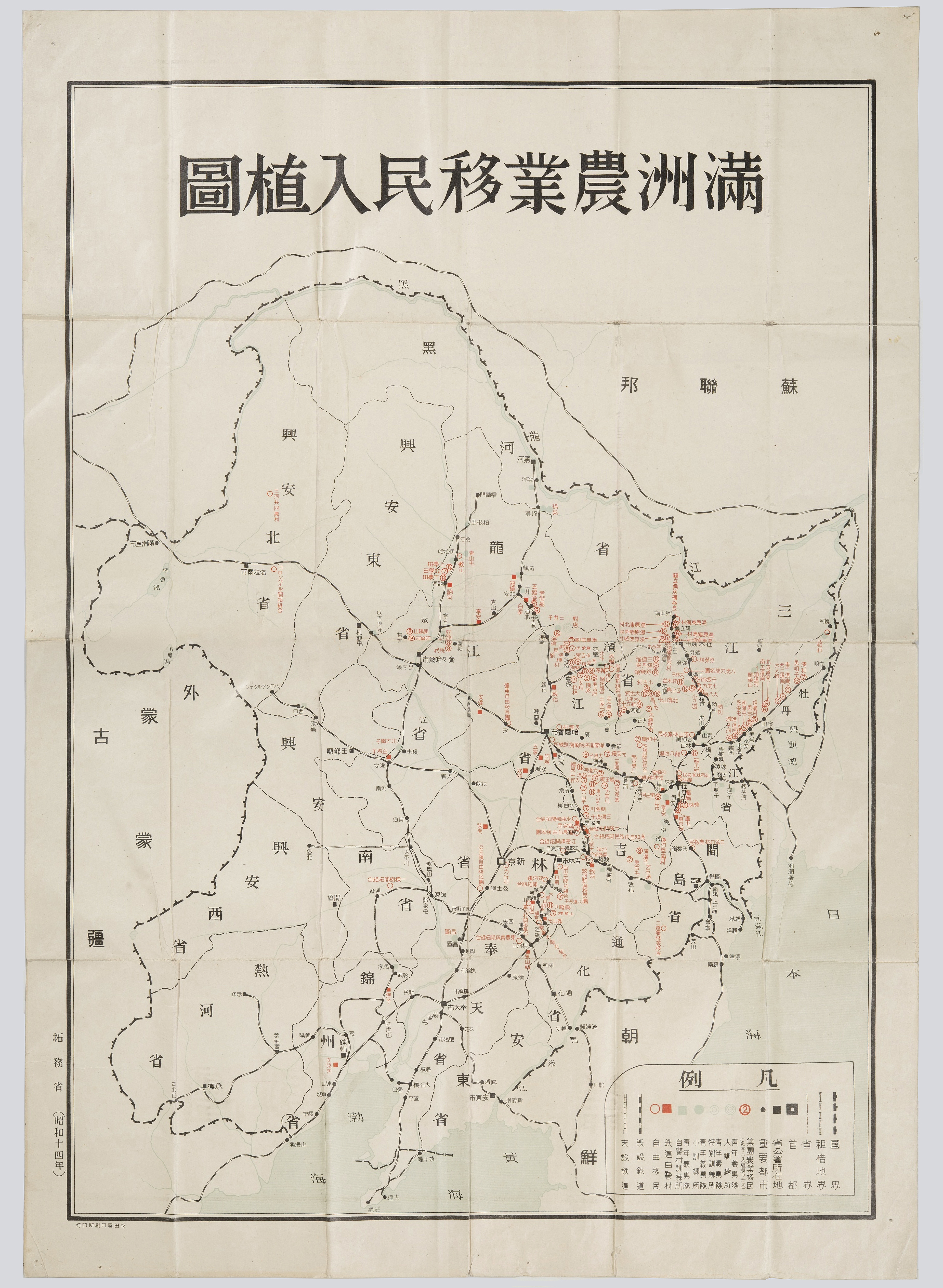 這幅侵華日軍1939年“滿洲農(nóng)業(yè)移民入植圖”是1996年4月,由民間人士捐贈的。1996年6月,經(jīng)國家文物局專家鑒定組審定確認為國家一級文物,由東北烈士紀(jì)念館珍藏至今。這幅“滿洲農(nóng)業(yè)移民入植圖”縱76厘米、橫54厘米,以紅、黑、淺藍三色膠版印刷于100克凸版紙上,由日本拓務(wù)省出版、杉田屋印刷所承印于昭和十四年(1939年),目前保存完好。