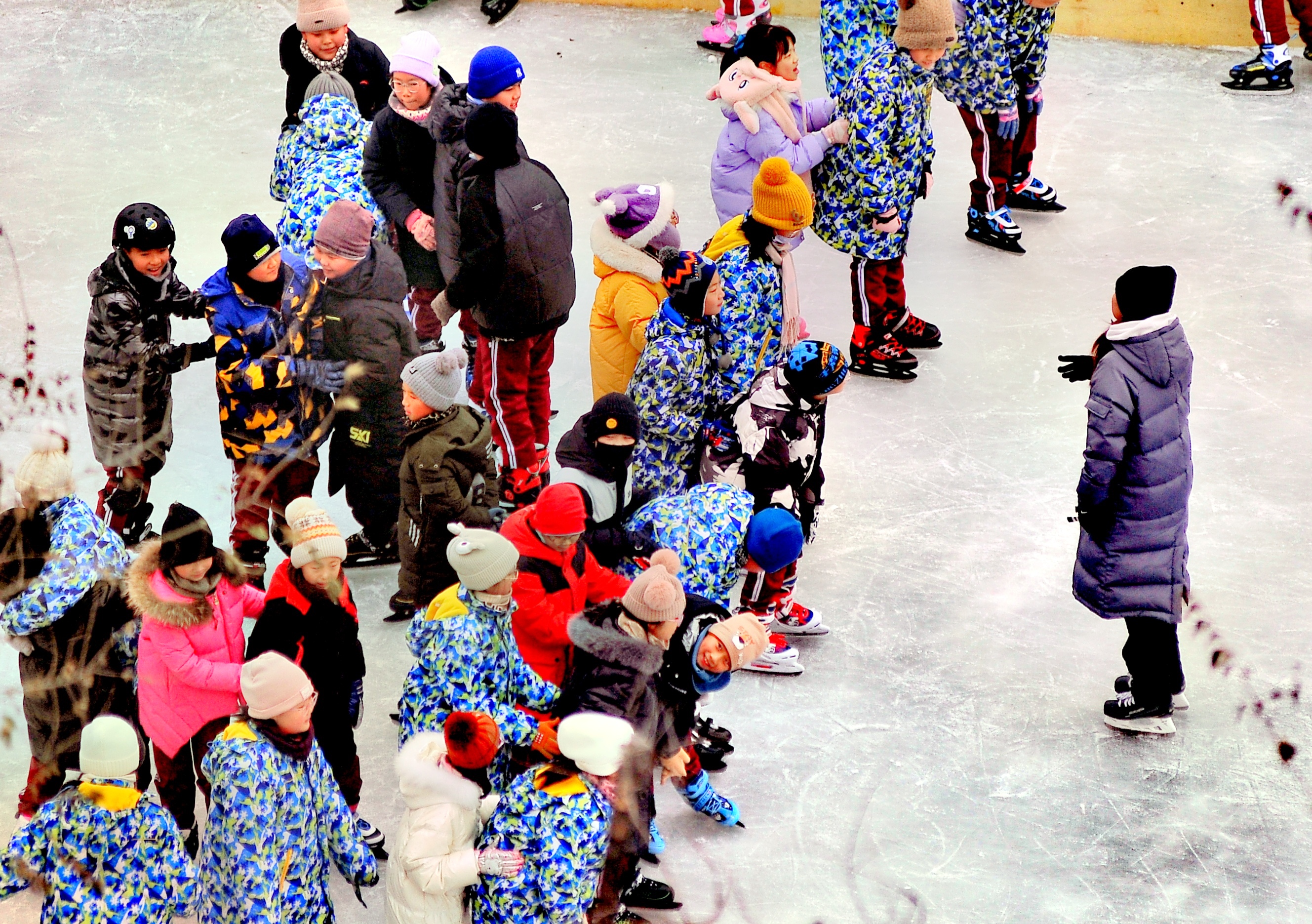 8日,哈爾濱市大同小學(xué)的冰場內(nèi),數(shù)十名小學(xué)生在上冰上課。