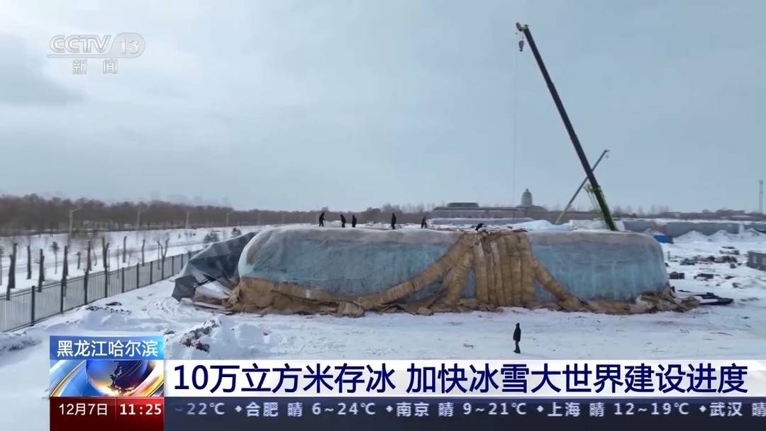 畫面中這些被蓋起來的是一個(gè)個(gè)大冰垛,就是今年哈爾濱冰雪大世界提前開工的秘密,這里面一共存了10萬立方米的冰,這些冰都是上一個(gè)冬天提前從松花江中采好儲備的。