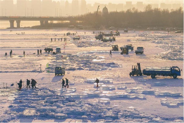 哈爾濱冰雪大世界采冰工作現(xiàn)場。