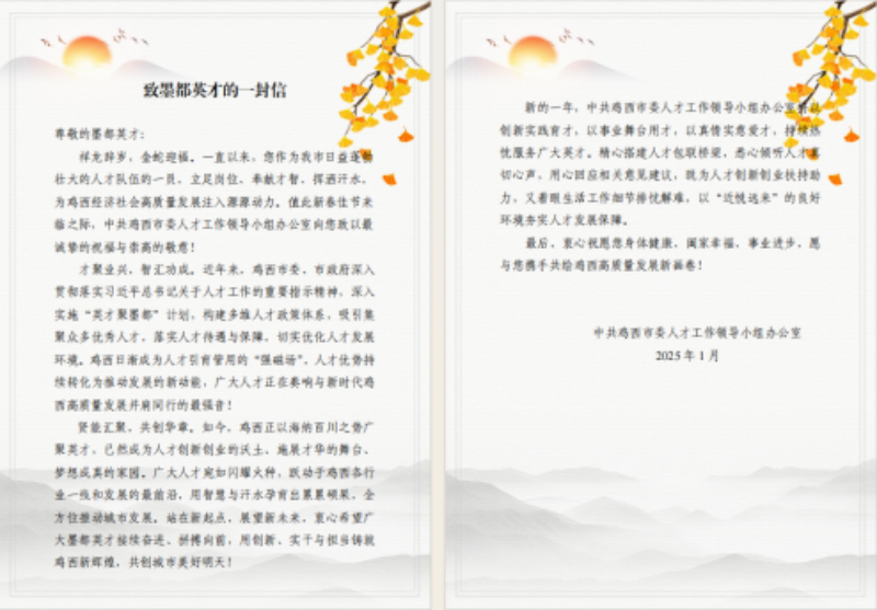 在近日召開的雞西市人才包聯(lián)服務工作座談會上,雞西市人民醫(yī)院影像科副主任醫(yī)師時建文表示,“通過組工干部包聯(lián)服務,解決了我愛人工作調轉、女兒轉學以及公寓住房一系列問題,希望包聯(lián)服務能夠延伸擴面,在科研創(chuàng)新、醫(yī)療實踐中給予更多支持”,來自教育、衛(wèi)生、農業(yè)農村、政法、食藥檢測等領域,以及入住市縣人才公寓的人才代表暢所欲言,提出很多好想法、好建議。雞西市深入開展高層次人才包聯(lián)服務,由市縣兩級組工干部與1541名高層次人才結成對子,通過定期走訪、座談交流、微信溝通等多種方式,及時了解人才的需求和困難,提供多元化、精準化服務,有效協(xié)調解決交通出行、子女教育、配偶安置等方面問題74個。市委組織部向包聯(lián)人才發(fā)出了《致墨都英才的一封信》,表達節(jié)日問候,展示雞西經濟社會良好發(fā)展態(tài)勢,激發(fā)廣大人才干事創(chuàng)業(yè)熱情。