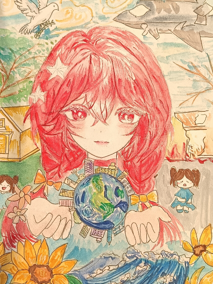 我創(chuàng)作這幅畫(huà),以“熱愛(ài)和平、反對(duì)戰(zhàn)爭(zhēng)、共創(chuàng)未來(lái)、憧憬發(fā)展”為主題。紅發(fā)女孩是祖國(guó),頭頂星星代表黨和人民,她托舉地球,寓意守護(hù)家園。周邊建筑是未來(lái)建設(shè)成果?!∨⑸砗螅髠?cè)是和平生活:完美的家、奔跑的孩子、銜枝和平鴿;右側(cè)是戰(zhàn)爭(zhēng)慘狀:破碎家園、失所兒童、荒蕪草地、轟炸機(jī),形成對(duì)比?!〉厍蛳碌南蛉湛笳魑磥?lái),海浪代表困難,寓意風(fēng)雨后是新未來(lái)。愿人們珍視和平,共創(chuàng)未來(lái)。